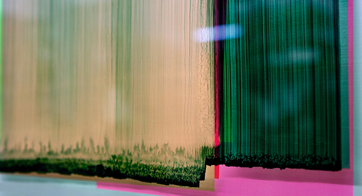 Übergossen mit einem dickflüssigen, in einem starkfarbigen Grundton gehaltenen und die Leinwand hermetisch umhüllenden Farbbrei geriert sich ein Bildkörper, der Farbe als Material physisch erfahrbarbar macht.…