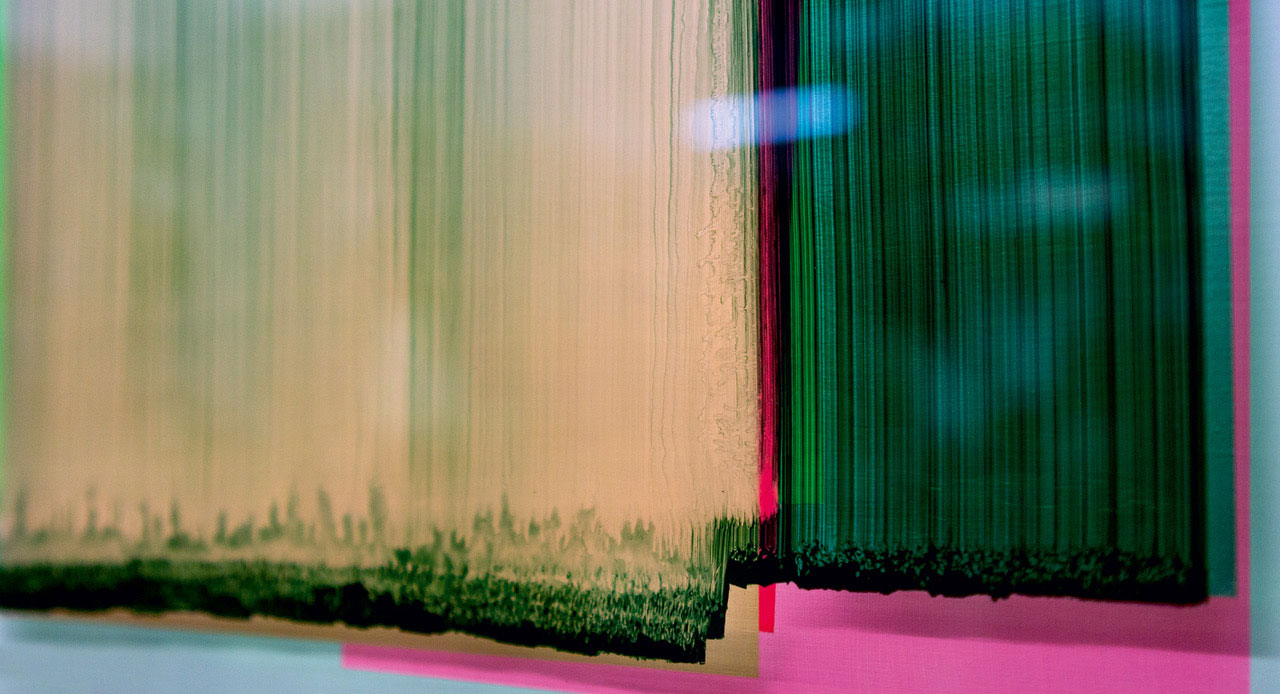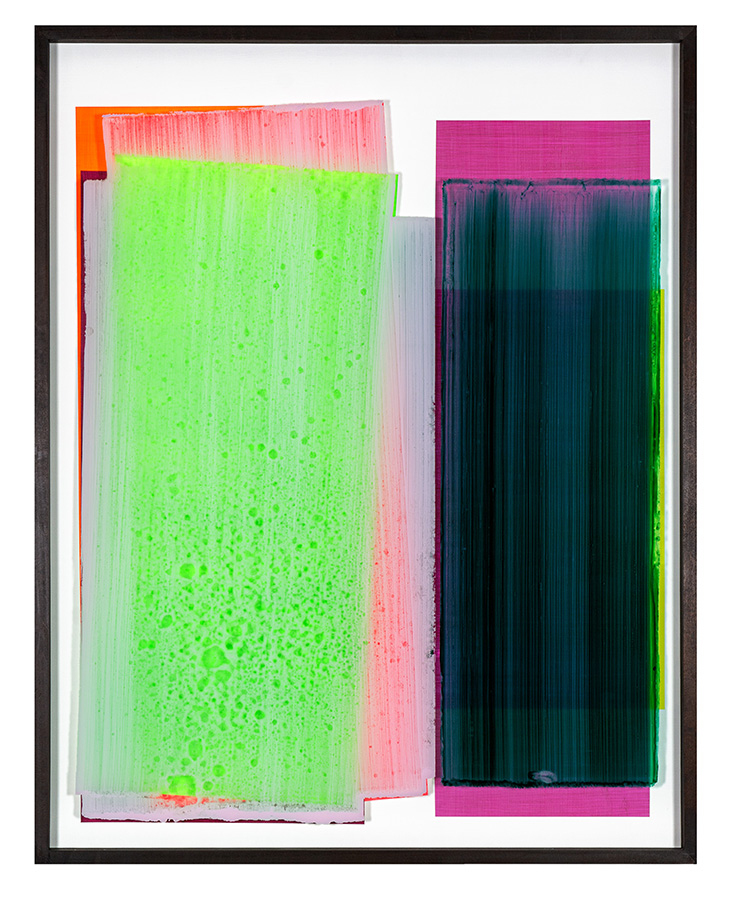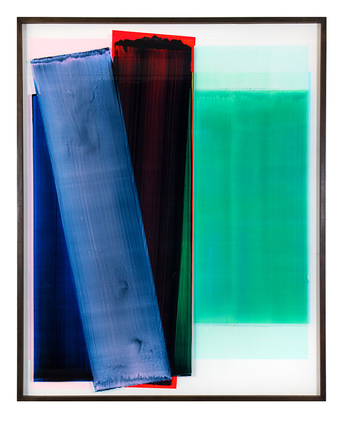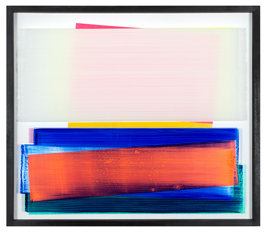Die zweischichtigen Überlagerungen der intensivfarbigen Malerei führen in der
